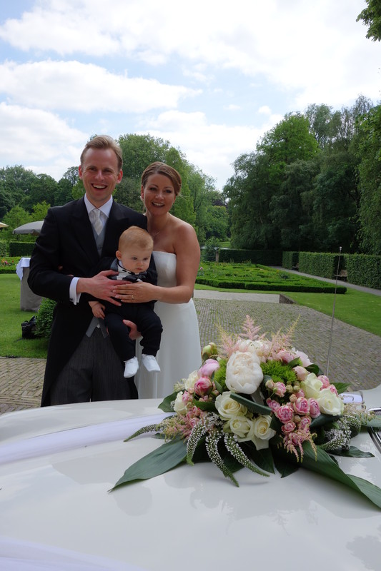 Romantische autoversiering/autodecoratie in een ronde vorm met diverse soorten Rozen, Veronica, Pioenen, Astilbe.