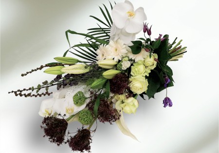 Kiest u voor een rouwboeket? Het rouwboeket is een veelal eenzijdig (platte achterkant) ,hand gebonden boeket met bladmateriaal en wordt afgewerkt met (wit) lint. U kunt kiezen voor diverse kleuren, grootte, modern of klassiek, rekening houdend met de overledene. Het rouwboeket kan worden geleverd met een bijpassend lint of kaart en/ of bijpassende vaas. (Bij de meesten aula/crematoriums zijn vazen wel aanwezig).