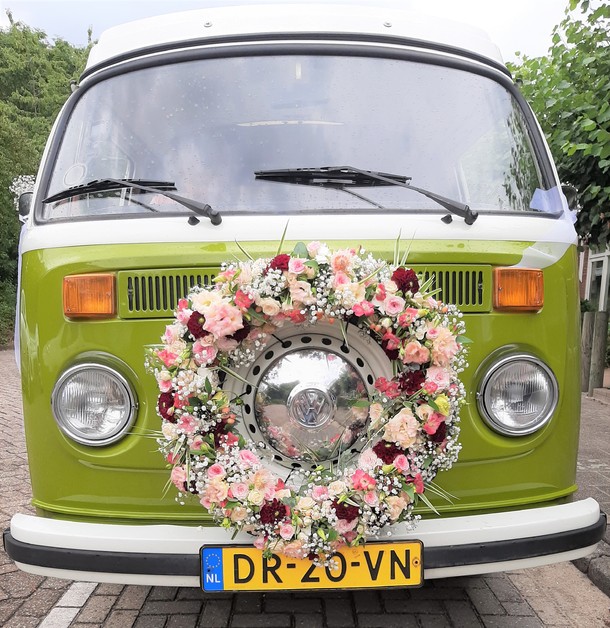 Trouw jij ook in zo'n gave VW-bus? Dan kunnen wij een mooie krans autoversiering maken op de reserveband.