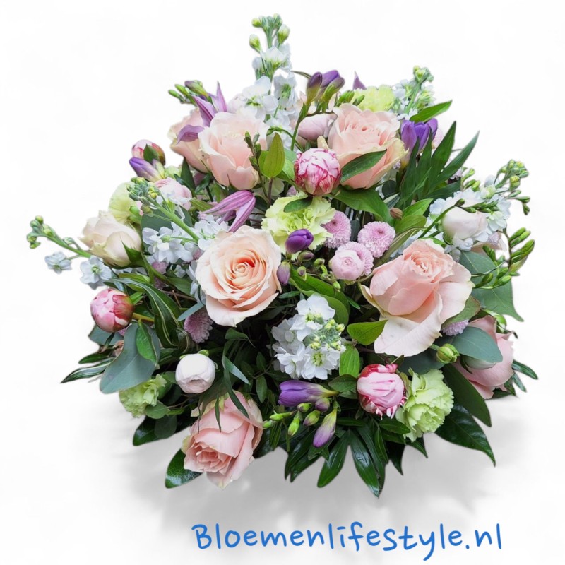 Gebruikte materialen o.a. Matthiola, Dianthus, Freesia, Pioen, Roos en diverse bladmaterialen.