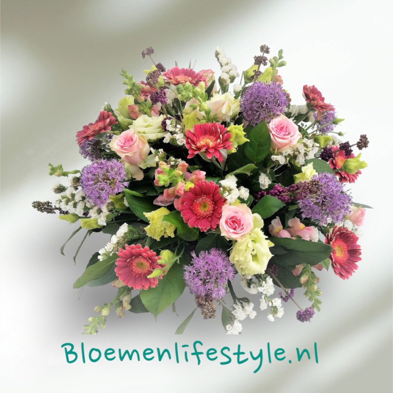 Biedermeier met o.a. Alliums, Leeuwenbekken, Lisianthus, Gerbera, Rozen, bijmaterialen en diverse bladmaterialen.