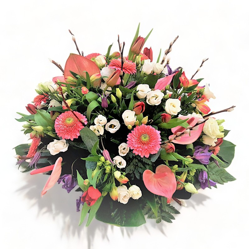 Biedermeier Lenteachtig met o.a. voorjaarstakken, Tulpen, Clematis, Ranonkels en diverse bladmaterialen.