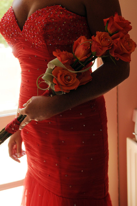Modern eigentijds bruidsboeket in de vorm van een 'stafje' in rood/oranjekleur rozen. Verwerkt zijn Tillandsia en pareltjes met lint.