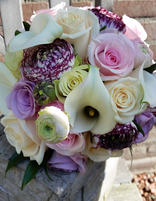 Compact bruidsboeket in zachte pastelkleuren. Bruidsboeket met o.a. Ranonkels, Rozen, Calla