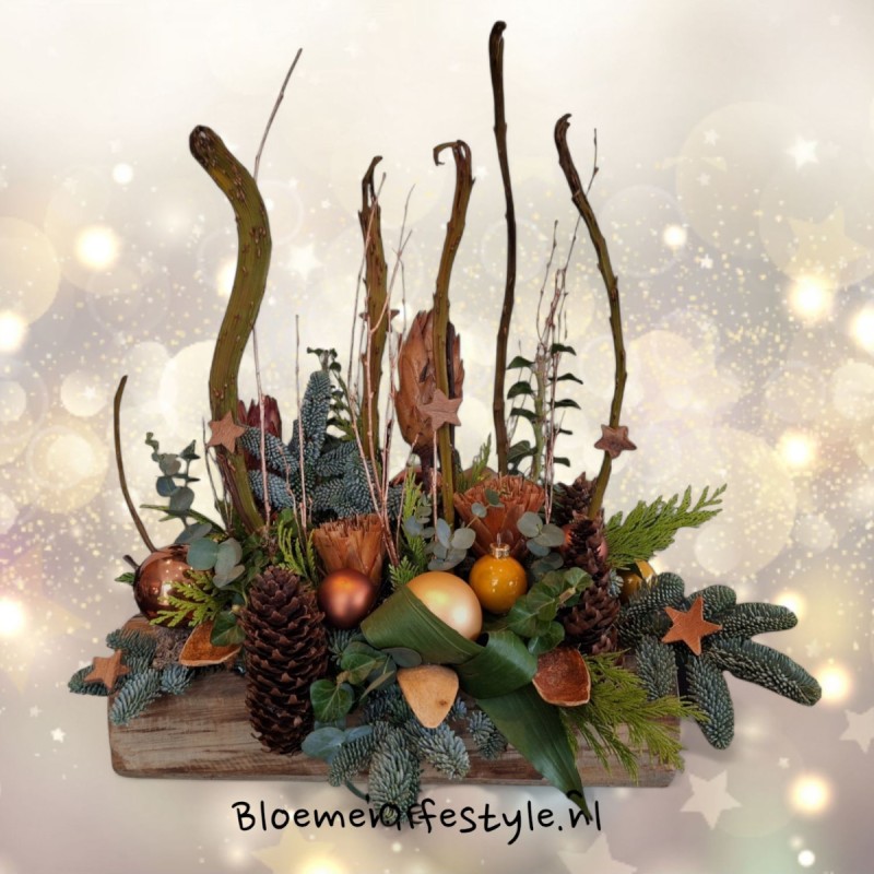 Bestaande uit stoere takken bandwilg, kerstgroen, kerstballen en droogmaterialen. Leuk om cadeau te doen of voor jezelf!