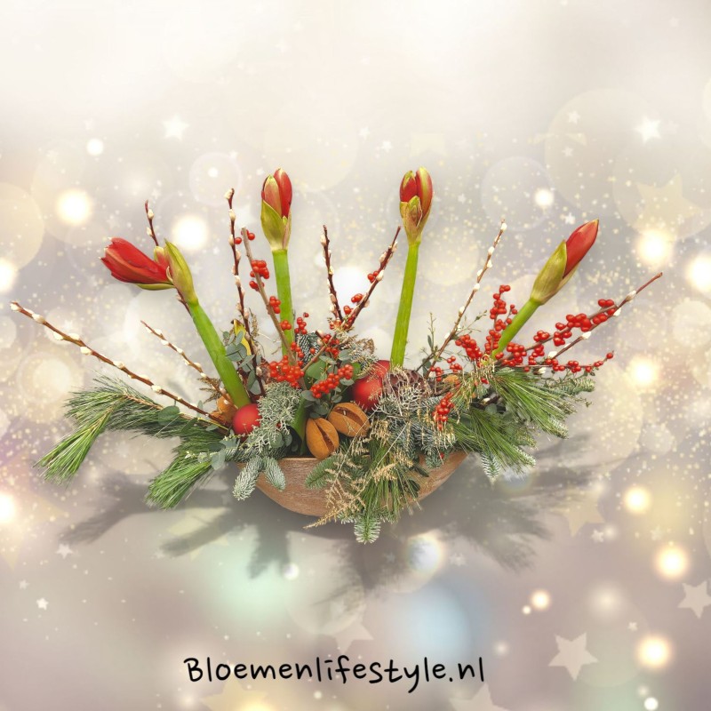 Prachtig groot kerststuk in bootvorm met decoratieve natuurlijke takken, Skimmia, kerstballen en natuurlijk Amaryllis.