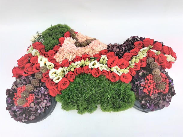 Zo zijn er diverse vormen te verkrijgen zoals deze motor. Ook een fiets, muzieknoot etc. is te verkrijgen in de bloemen waar de overledene van hield.
