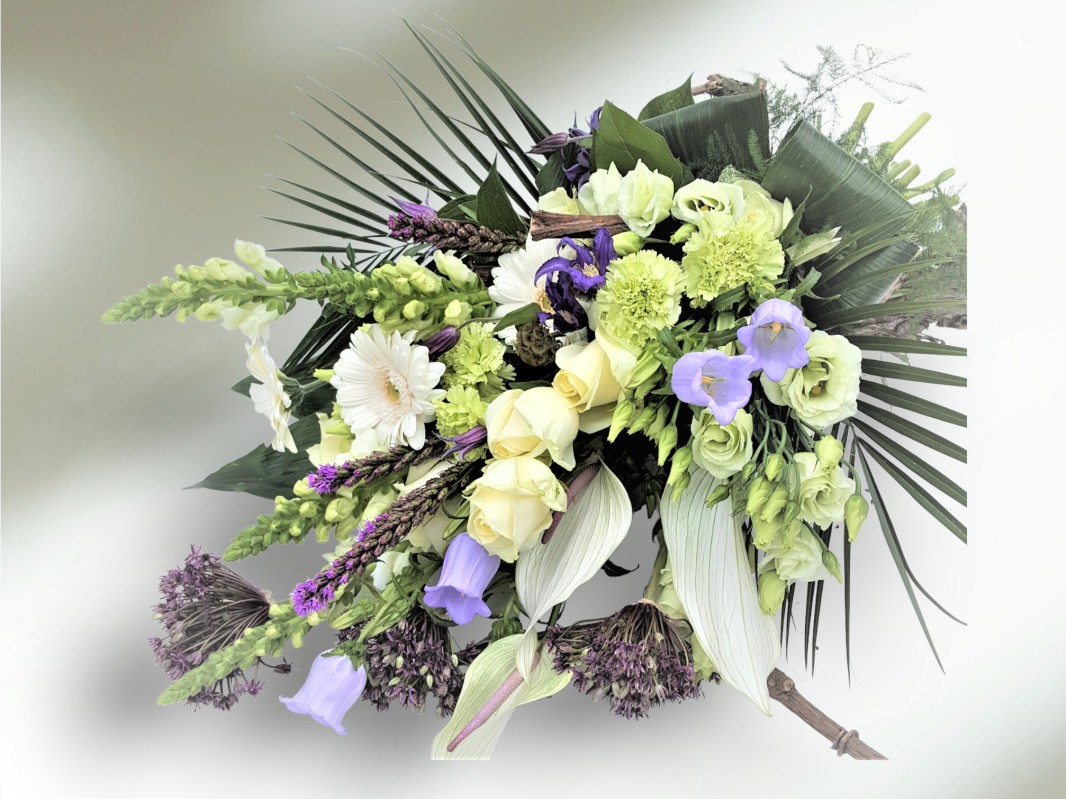 Rouwboeket met o.a. Rozen, Campanula, Clematis, Leeuwenbek, Gerbera, Anthuriums en diverse bladmaterialen.