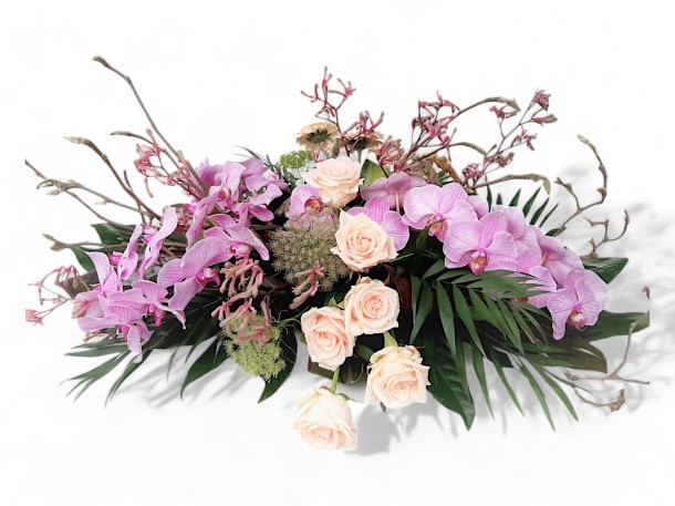 Dit stijlvolle rouwstuk bestaande uit: o.a. Phalaenopsis, Calla, Rozen, Clematis, takken en groenmaterialen.