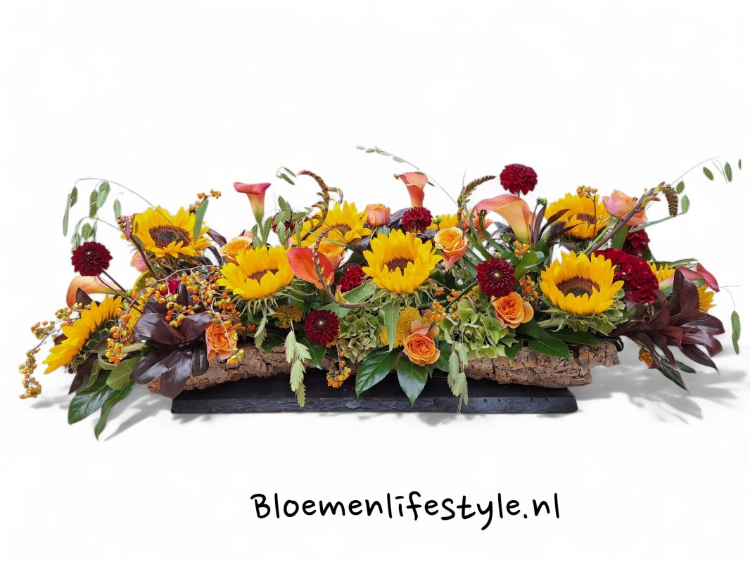 Dit rouwarrangement bestaat o.a.: een prachtige natuurlijke bodem van kurk, Zonnebloemen, Grassen, Calla, Dahlia indien verkrijgbaar en diverse bladmaterialen